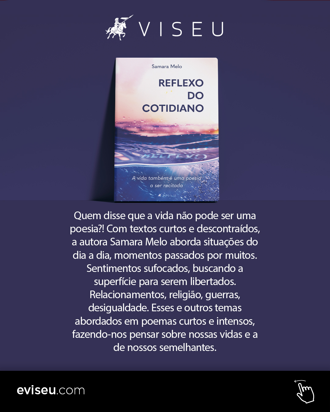 Samara Melo: O Livro Reflexo do Cotidiano pode ser adquirido em formato físico ou e-book pelo site da Editora Viseu. A Partir de lá vocês podem ter acesso a outros sites como Amazon, kobo e outros.